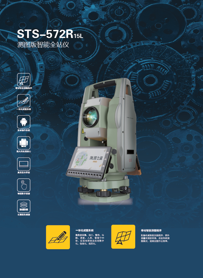 STS-572R15L测图版智能全站仪 STS-572R15L测图版智能全站仪,创新性地利用安卓智能操作系统,结合高性能数据处理单元,全新定制的专业测图成图软件系统,专为数字化测图作业而生。优化外业测绘各个环节,外业智能化数据采集,移动端便携式数字草图绘制,桌面端规范化高效成图,云端一体化生产管理协同作业,高效成图,规范管理。数据从生产、加工到无缝接入GS库,一气呵成,无后顾之忧实现移动互联网智能化测绘,开创专业测图智能时代。 技术亮点